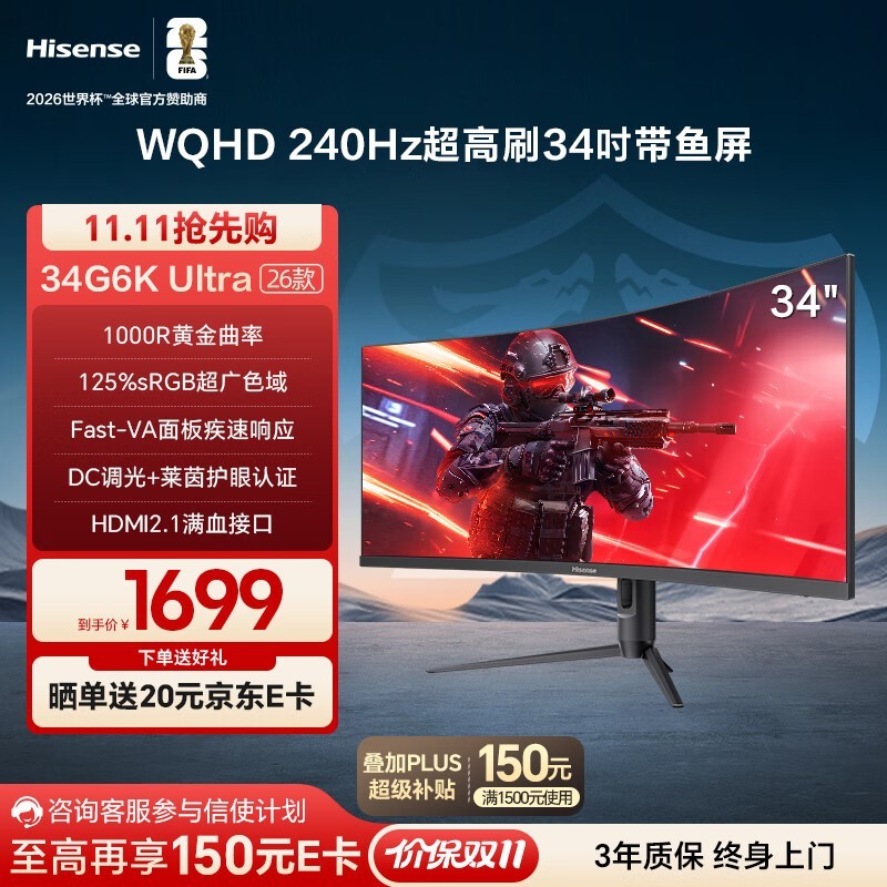 海信Hisense34英寸带鱼屏显示器34G6KUltra现已重磅优惠,专业电竞曲面屏实力登场,搭载240Hz超高刷新率,画面流畅顺滑,轻松应对高速竞技场景,1000R黄金曲率带来沉浸式视觉体验,WQHD级分辨率配合HDR400认证,色彩细腻真实,细节层次丰富,内置音响设计节省空间,简化桌面布局,无论是游戏娱乐还是多任务办公都能轻松胜任。