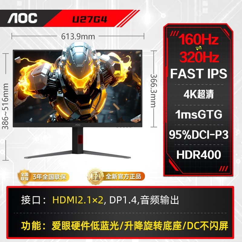 AOC G4宙斯盾推出的U27G4 27英寸显示器值得关注。AOC U27G4采用IPS面板,拥有3840×2160的高分辨率、320Hz的高刷新率、95%DCI-P3广色域以及HDR400技术,还具备MBR Sync功能。
