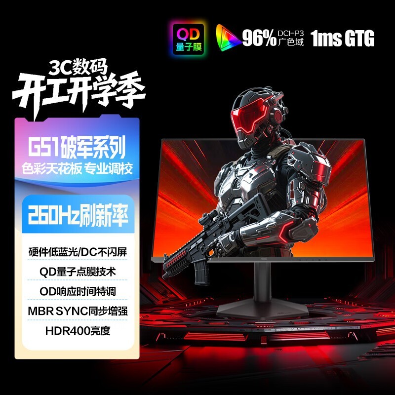 AOC 24G51Z电竞显示器采用24寸全高清Fast IPS面板 165Hz刷新率与1ms GTG响应协同消除高速画面拖影。广色域覆盖与色准优化 令游戏场景色彩鲜活且层次分明 提升沉浸体验。搭载Adaptive-Sync技术 动态同步显卡帧率 抑制撕裂与卡顿。AOC 24G51Z电竞显示器的暗部增强功能提升阴影区目标可视性 助力竞技先手判断。