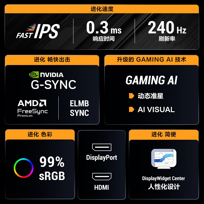 华硕 VG279QM5A 搭载 27 英寸 FastIPS 面板,实现 240Hz 刷新率与 1ms GTG 响应,高速画面切换顺滑无残影,FHD 分辨率保证细节锐利,99% sRGB 色域让色彩鲜活。其设计注重高刷新与舒适护眼的结合,低蓝光与不闪屏模式减轻长时间竞技的眼部压力。可升降旋转支架适配多种观看姿势,满足不同竞技场景需求。