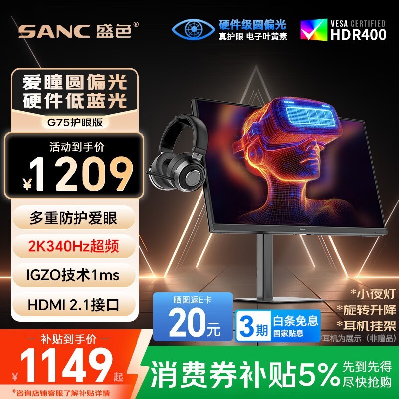 SANC G75 自适应同步技术加3440×1440宽屏,高帧率赛车与射击游戏的沉浸搭档