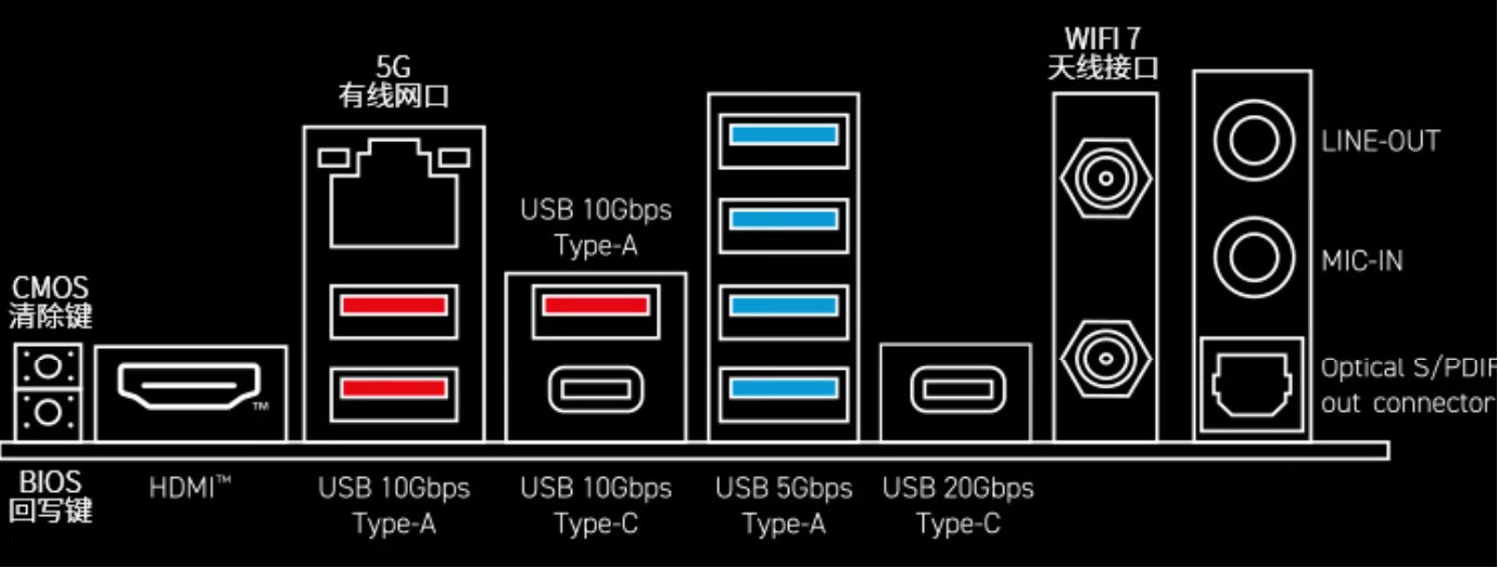 其他方面,微星 B850M MORTAR WIFI亮点十足,网络配备WIFI 7无线网卡和5Gbps有线网卡,拓展方面备了1个USB3.2 Gen2x2 20Gbps Type-C、1哥USB3.2 Gen2 10Gbps Type-C、3个USB3.2 Gen2和4USB3.2 Gen1 Type-A,以及高清音频接口和HDMI视频接口,全方位覆盖用户的外设连接需求。