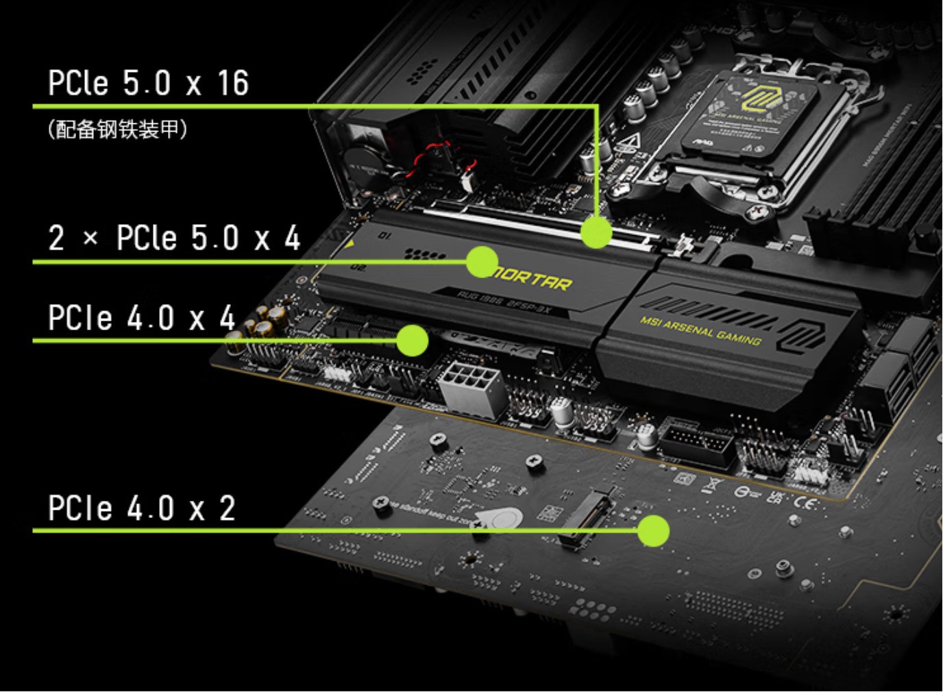 微星 B850M MORTAR WIFI扩展性上,配备四条DDR5双通道内存插槽,支持高达8200MHz的高频内存,满足用户对多任务处理和内存性能的高要求。存储接口方面提供两个PCIe5.0x4 M.2接口,大幅提升固态硬盘读写速度;还配备PCIe5.0x16显卡接口,能够充分释放新一代独立显卡的性能潜力。