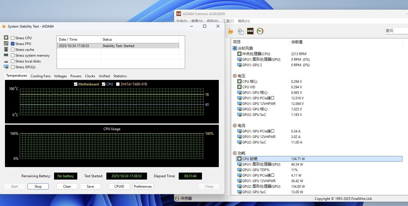 最后是压力测试环节,我们使用AIDA64进行FPU拷机测试,在经过30分钟的满载压力测试之后,可以看到R9 9800X3D的功耗稳定在134W,温度则仅有77℃,也就是说对于这款热门的CPU来说,七彩虹 B850M ARK FROZEN V14 方舟完全无压力。