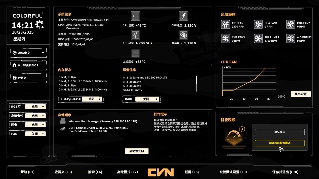 针对AMD X3D系列CPU,七彩虹 B850M ARK FROZEN V14 方舟的BIOS还专门加入了AMD X3D Gaming Mode,开启后可优化CPU缓存性能,提升游戏帧率;此外,还提供“低延迟模式” 与 “高效能模式”,分别适配游戏场景与生产力场景,满足不同用户的需求。