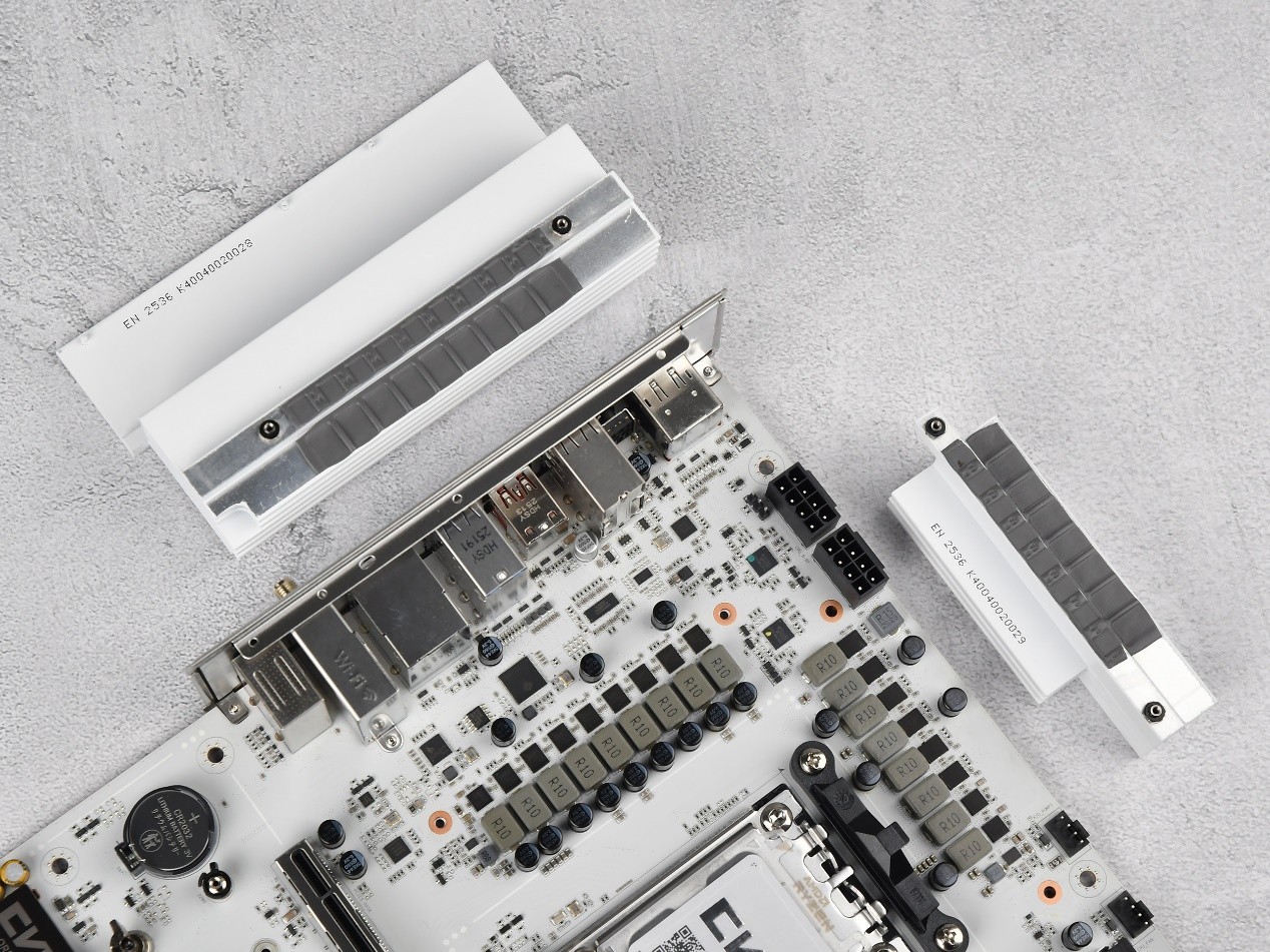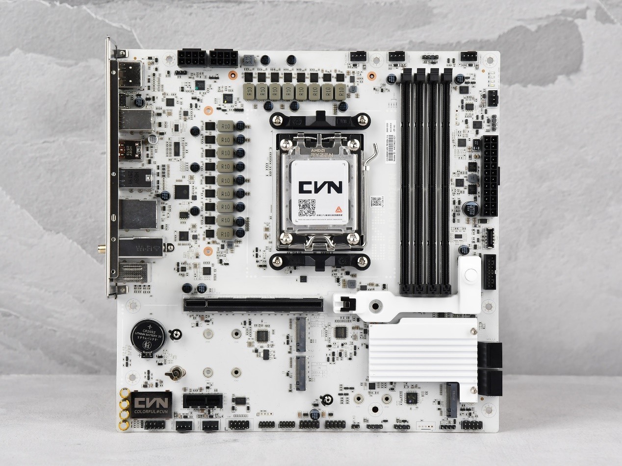 从视觉上看,这款主板整体采用简约百搭的设计语言,全白喷漆的寒霜装甲是最大亮点,装甲表面运用激光雕刻与CNC精工切割工艺,细腻刻画星座星图纹路,搭配CVN标志性的点阵艺术,既避免了纯白设计的单调,又不会显得过度浮夸,无论是搭配纯白主题、赛博朋克风格还是经典黑色主机,都能无缝融入。