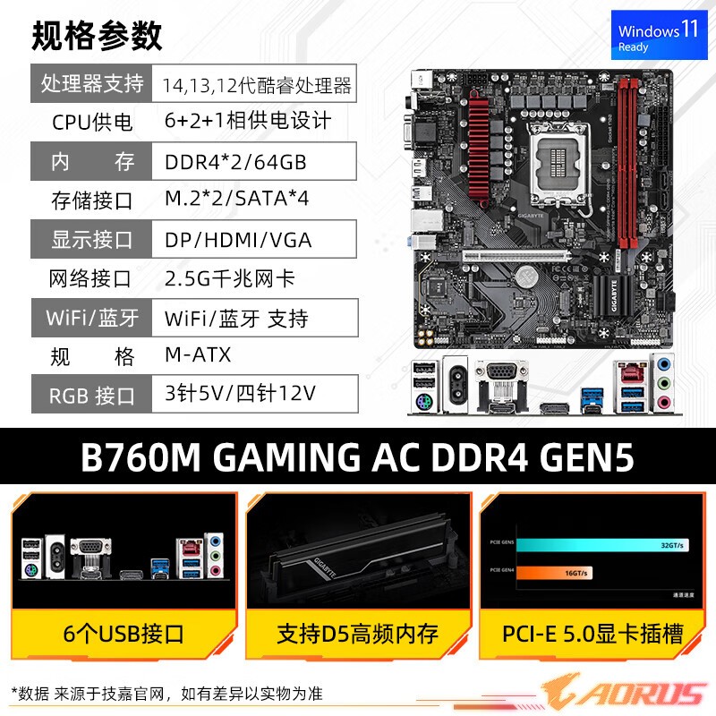 技嘉 B760M G AC D4 GEN5 魔鹰WiFi MATX 主板 支持DDR4 PCIe5 WiFi6 2.5GbE