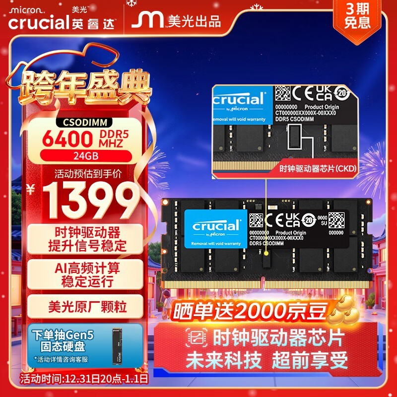 英睿达 24GB DDR5 6400 内存条 钜惠畅享高频疾速性能