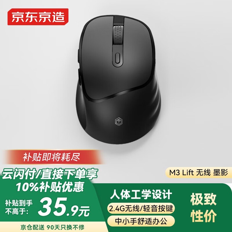 京东京造 M3 Lift 无线鼠标人体工学 中小手2.4G轻音办公小巧便携mac苹果电脑笔记本台式机 非对称造型 墨影