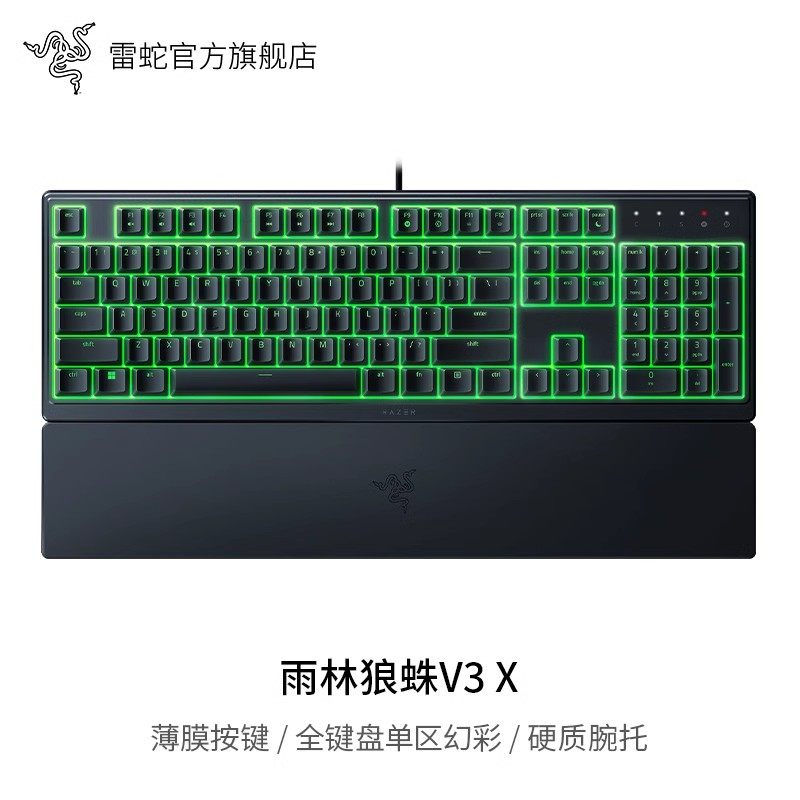 雷蛇 雨林狼蛛 V3 为 104 键全尺寸机械键盘,采用雷蛇自研绿轴(Razer Green Switch),触发压力约 50g,触发键程 1.9mm,总行程 4.0mm,按压反馈清脆利落,适合游戏与打字双重需求。键帽为双色注塑 ABS 材质,字符耐磨不易脱落,表面略带弧度贴合指尖,提升长时间输入的舒适度。全尺寸布局保留独立数字小键盘,方便财务、编程及数据处理类工作高效录入。