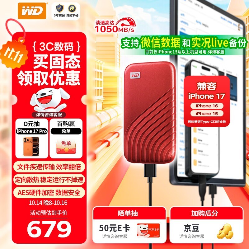 西部数据 My Passport随行SSD系列移动固态硬盘现正限时优惠,1TB星火红版本原价689元,现京东促销到手价仅需679元,性价比出众不容错过。西部数据 My Passport SSD采用全金属机身设计,外观紧凑纤薄,尺寸仅为10 x 5.5 x 0.9cm,重量约45克,轻松放入口袋或包内,随身携带无负担。西部数据 My Passport圆润机身搭配尾部流线型凹印,不仅手感舒适更具备出色耐用性,可承受高达1.98米的垂直跌落冲击。西部数据 My Passport内置高性能SSD颗粒,支持USB 3.2 Gen 2接口,传输速度高达1050MB/s读取和1000MB/s写入,大幅提升文件拷贝效率。西部数据 My Passport支持256位AES硬件加密,保障数据安全,兼容Windows与Mac系统,即插即用无需繁琐设置。同时西部数据 My Passport可通过专用软件实现本地快速备份与云备份,管理文件更高效。更令人安心的是,产品提供长达五年质保服务,品质有保障,是移动存储的理想之选。