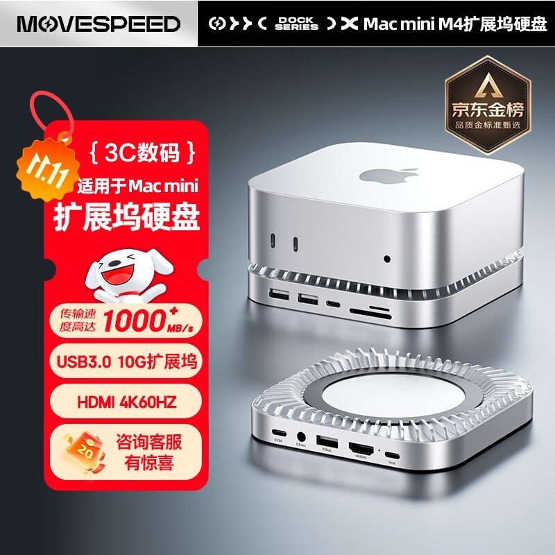 移速 M4 1TB移动固态硬盘兼容Macmini散热底座拓展坞,集高速传输与高效散热于一体,采用Type-C接口支持USB 3.2 Gen2协议,读取速度高达1000MB/s,轻松应对大文件传输、视频剪辑及外接存储扩展需求,铝合金机身兼顾质感与散热性能,适配MacBook、Mac mini等多种设备,现京东活动售价999元,参与每满850元减100元优惠,到手价仅899元,性价比出众,是苹果生态用户值得入手的高性能存储解决方案。
