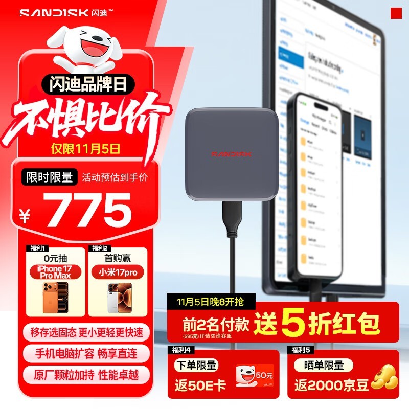现在京东闪迪 ELE移动固态硬盘活动售价829元,下单还能领取品类券满20.01减20,大促神券满1.89减1.88优惠券,下单1件,实付低至753.12元,相比原价829元,能节省不少费用,赶快行动把它带回家吧。