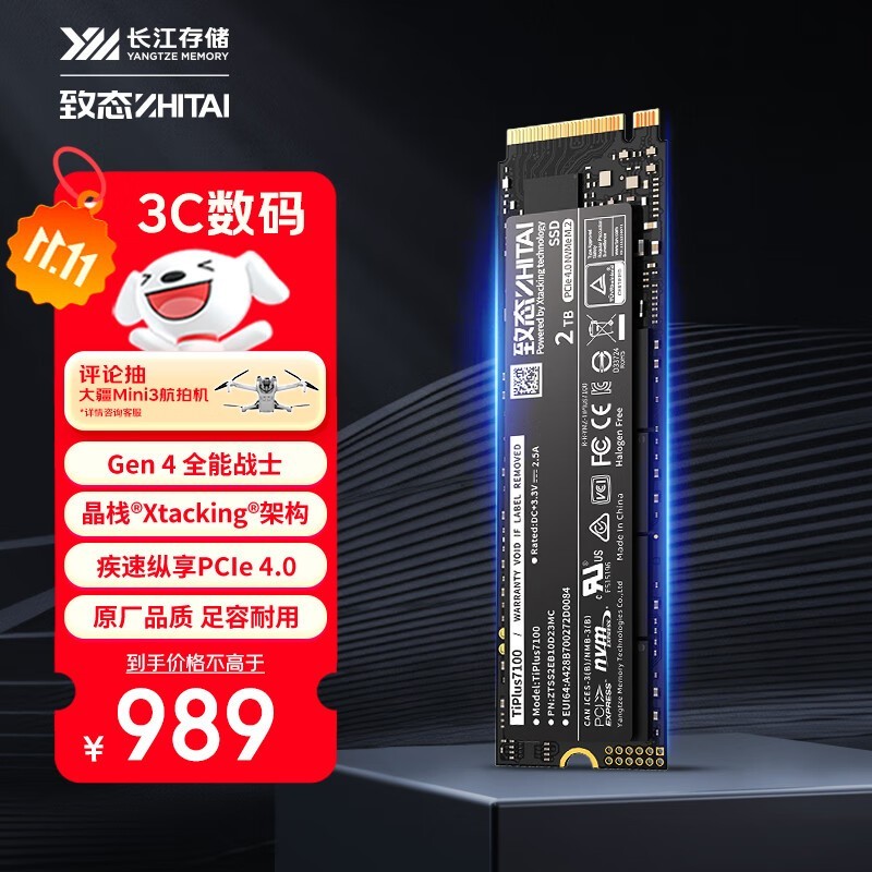 在京东,致态 TiPlus7100固态硬盘目前活动售价 989 元,下单 1 件,实付低至 969 元。